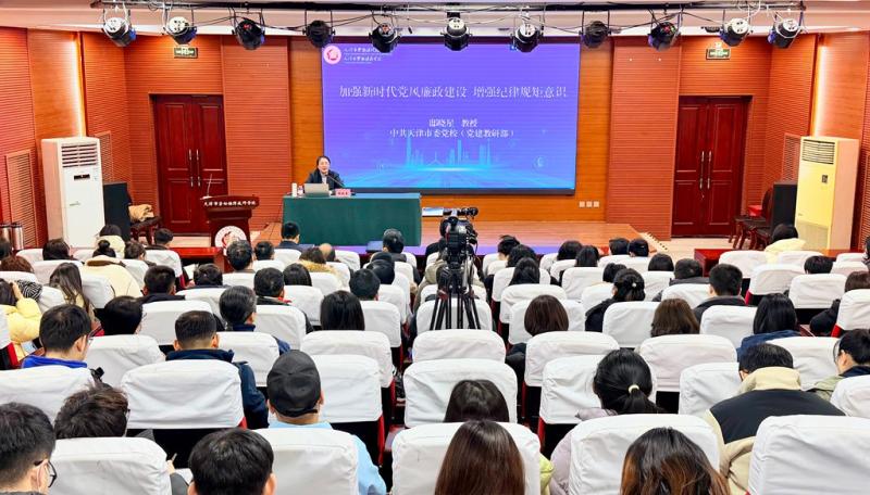授课现场,天津市习近平新时代中国特色社会主义思想讲师团成员、市委党校教授邸晓星围绕“加强新时代党风廉政建设 增强纪律规矩意识”主题,紧扣习近平总书记关于党的自我革命的重要思想,深入阐释全面从严治党新部署新要求,结合典型案例生动解读党章党规党纪,引导教职工筑牢廉洁从教思想防线。
